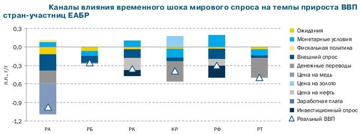 «Сокращение мирового выпуска вызовет падение цен сырьевых товаров, в том числе нефти и металлов, в связи со снижением их потребления в качестве фактора производства», – подчёркивают авторы исследования, что через торговый канал снизит экономический рост стран-членов ЕАБР на 0,3%. Выгоду из падения цен на сырьевые товары сможет извлечь только Кыргызстан, поскольку цена на экспортируемое им золото вырастет из-за глобальной неопределённости. Но и он понесёт экономические потери за счёт укрепления сома на фоне других валют региона, где плавающий курс «выполняет функцию „абсорбции“ внешних шоков, смягчая их негативное влияние на основные макроэкономические показатели».