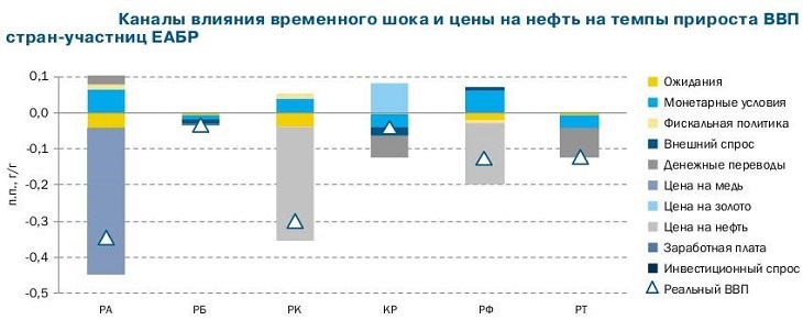 Также авторы доклада отмечают, что кроме внешних, в Союзе существуют и свои внутренние взаимозависимости. Пожалуй, для всех стран региона, кроме Казахстана, Россия является ключевым рынком сбыта своих товаров и источником денежных переводов от выехавших туда трудовых мигрантов. Если упадёт глобальный спрос на энергоресурсы и/или цена на нефть, то такие страны, как Армения, Белоруссия, Кыргызстан и Таджикистан почувствуют негативный эффект не столько напрямую, сколько через охлаждение экономики РФ.