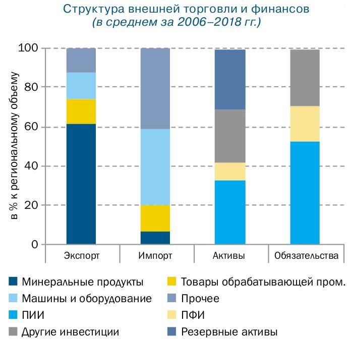 В целом страны-участники ЕАБР (Армения, Белоруссия, Казахстан, Кыргызстан, Россия, Таджикистан) занимают не слишком большое место в мировой экономике (2,5%), но плотно в неё интегрированы. «Оборот внешней торговли достигает трети суммарного ВВП стран региона, а с точки зрения финансовых потоков экономика демонстрирует еще большую степень открытости (внешние активы и обязательства – около 70% ВВП)», – подсчитали авторы доклада. Причём от страны к стране этот показатель сильно варьируется.
