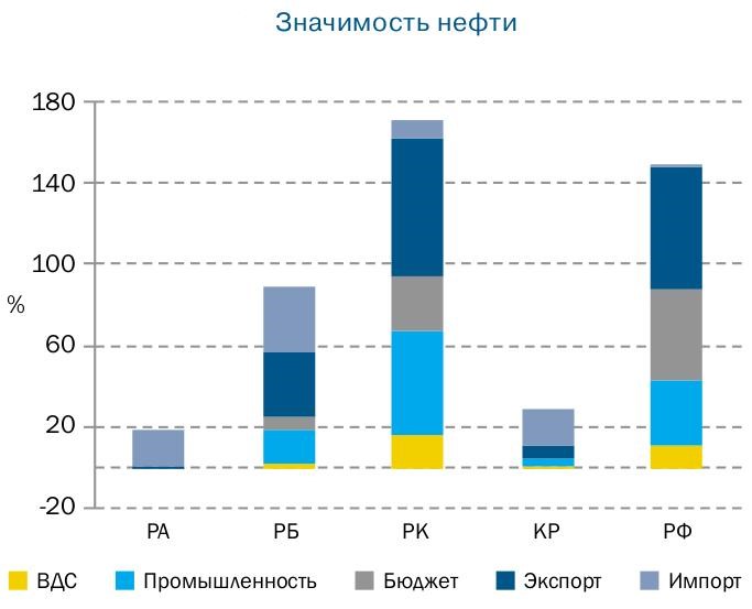 Колебание биржевых котировок будет особенно ощутимым в России, где нефтегазовые доходы формируют более 40% доходной части бюджета и 30% промпроизводства, а также в Казахстане, где эти цифры соответственно 25% и 50%. Падение стоимости нефти на 10% замедлит рост ВВП РФ на 0,13%, а Казахстана – на 0,3%. С другой стороны, «поддержку экономической активности в крупнейших странах региона, как и в случае шока внешнего спроса, окажет смягчение монетарных условий на фоне ослабления национальных валют», – считают авторы доклада.