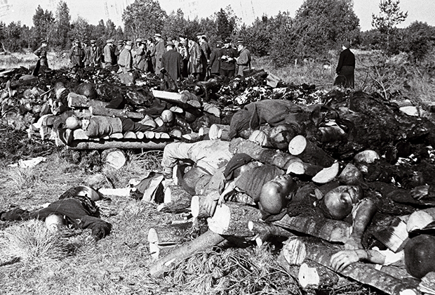 Костры с сожженными трупами в лагере Клоога и члены чрезвычайной комиссии по расследованию массовых казней, сентябрь 1944 года