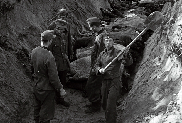 Немецкие военнопленные заканчивают рыть могилы для жертв массовой казни, сентябрь-октябрь 1944 года