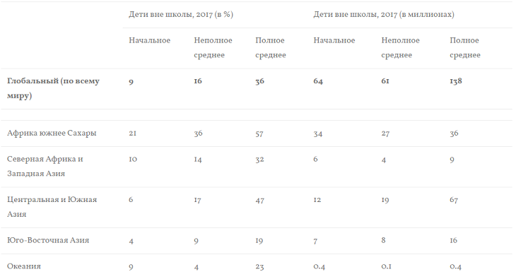Начальное и среднее образование. В 2017 году было 64 миллиона детей, не посещающих школу, младшего школьного возраста; эта цифра неизменна уже десятый год подряд. Общее количество детей вне школы в 2017 году составило 262 миллиона. Как в процентном, так и в абсолютном выражении регион Африки южнее Сахары лидирует по показателям детей вне школы. Между тем, Центральная Азия находится на третьем месте по этим показателям, что отодвигает регион от былой 100%-ной посещаемости школ. Также необходимо отметить, что статистика по непосещаемости школ самая высокая среди подростков в возрасте от 14 до 18 лет (полное среднее образование).