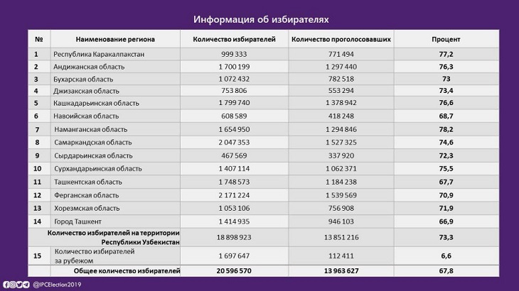 У экспертов вызывают сомнения официальные цифры по явке избирателей. Журналисты CABAR.asia опросили 30 знакомых жителей Ташкента и среди опрошенных ни один не явился на свой избирательный участок.