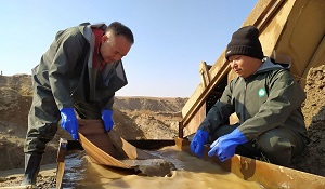 «С каждого ведра промытого грунта и песка вперемешку обнаруживается три-четыре грамма золота. Здесь его много, но для промывки нужна вода. Мы прорыли скважину и используем подземную воду. Золото есть, но нет воды», – говорит Eurasianet.org Ханг Джианг.