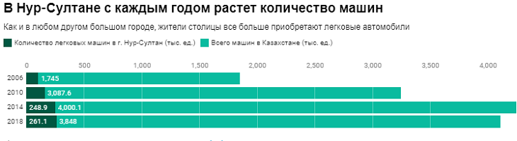 Естественным желанием для обычного жителя Нур-Султана является покупка и дальнейшая эксплуатация автотранспортного средства, ввиду того, что город является второй после монгольского Улан-Батора самой холодной столицей в мире. В связи с этим, нагрузка на транспортную сеть города с каждым годом увеличивается из-за внутренней миграции из других регионов в Нур-Султан и высокой рождаемости. В самом городе количество машин на 1000 жителей в 2016 году составило 340 единиц, данный показатель оказался выше, чем в таких городах, как Лондон и Баку. Всего же в столице, по официальной статистике, было зарегистрировано 261,1 тысяч легковых автомобилей на 2018 год.