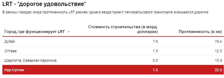 Система LRT функционирует во многих крупных городах мира, которые являются «магнитами притяжения» для туристов и мигрантов. Во многих странах реализация проекта строительства обошлась зарубежным государствам недешево: к примеру, в Дубае окончательная стоимость составила порядка $7,8 миллиардов при протяженности в 74,6 километров и 49 станций. Проект LRT в Нур-Султане по протяженности значительно уступает Дубайскому – 22,5 километра (18 станций), а окончательная стоимость составит 1,5 миллиарда долларов. Ежедневный пассажиропоток наземного метро в Дубае на сегодня порядка 600 тысяч человек, в Нур-Султане мэрией прогнозируется ежедневно 146 тысяч пассажиров. Президент Токаев подверг критике данные прогнозы, указав на то, что только 2 тысячи человек ежедневно проезжают по маршруту LRT. В связи с этим встает вопрос о целесообразности такого дорогостоящего проекта и окупаемости его не только в ближайшем будущем, но и в долгосрочной перспективе.