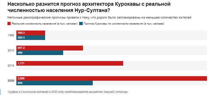 В 1998 году японский архитектор Кисё Курокава представил первому президенту страны Нурсултану Назарбаеву генеральный план новой столицы Казахстана, который отличился от других проектов инновационным подходом в области архитектуры зданий. Однако известный зодчий в своих экономических расчетах основывался на реалиях, происходивших в Казахстане в 1990-е годы. По мнению экспертов, Курокава допустил ошибки в прогнозировании демографического «бума», который захлестнул страну после выхода из Азиатского кризиса, в связи с увеличением цен на нефть. Так, Кисё Курокава предсказал, что к 2010 году в тогда еще Астане будут проживать всего 490 тысяч жителей, а к 2030 года эта цифра удвоится и достигнет 800 тысяч.
