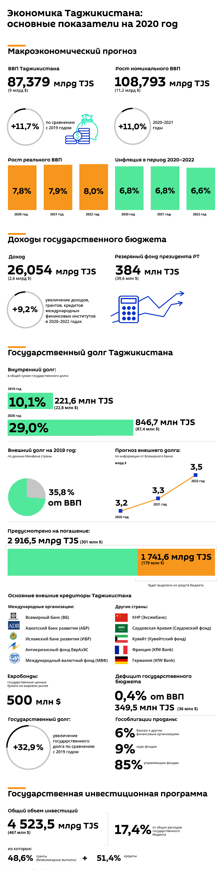 Было отмечено, что общие расходы на государственный бюджет в 2020 году из всех источников финансирования запланированы в размере 26,4 миллиарда сомони, или 30,2% к ВВП.