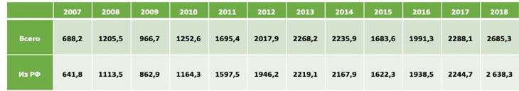 «Денежные переводы в Кыргызстан в 2007-2018 гг. в млн $».