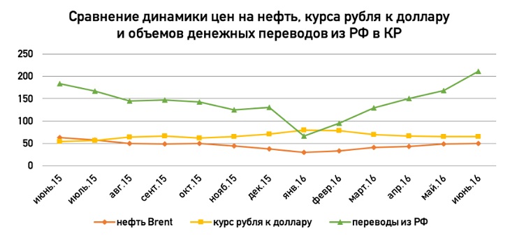 На этом графике можно проследить, как внешние факторы (связка «цена на нефть – курс рубля к доллару») влияют на объемы денежных переводов в Кыргызстан. Снижение цен на нефть марки «Brent» в 2014-2016 гг. существенно повлияло на курс рубля к доллару. С учетом того, что кыргызский сом девальвировался в меньшей степени, чем российский рубль, в проигрыше оказались наши мигранты. На протяжении нескольких лет до начала кризиса в 2011-2013 гг. рубль стабильно стоил примерно 1,5 сома.
