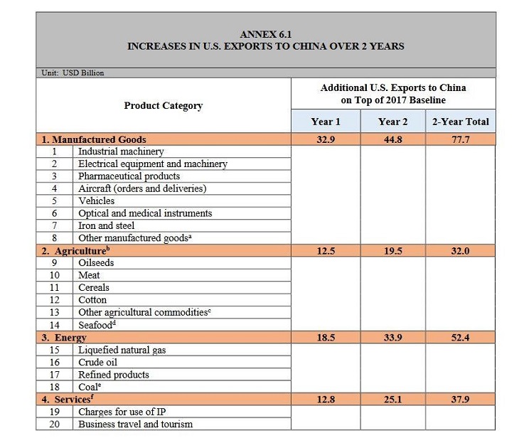 В соответствии с подписанным соглашением КНР в ближайшие 2 года обязуется осуществить дополнительную закупку американских товаров и услуг совокупным объёмом в 200 млрд долларов (промышленную, сельхоз- и агропродукцию, а также энергопродукты и различные сервисы).