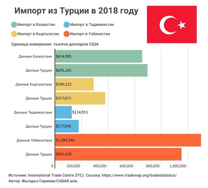 По данным Турции, объем товарооборота между Турцией и Кыргызстаном составляет 377 миллионов долларов США. Однако данные Кыргызстана показывают только 290 миллионов долларов США. Таким образом, отклонение в импорте составляет 87 миллионов долларов США.
