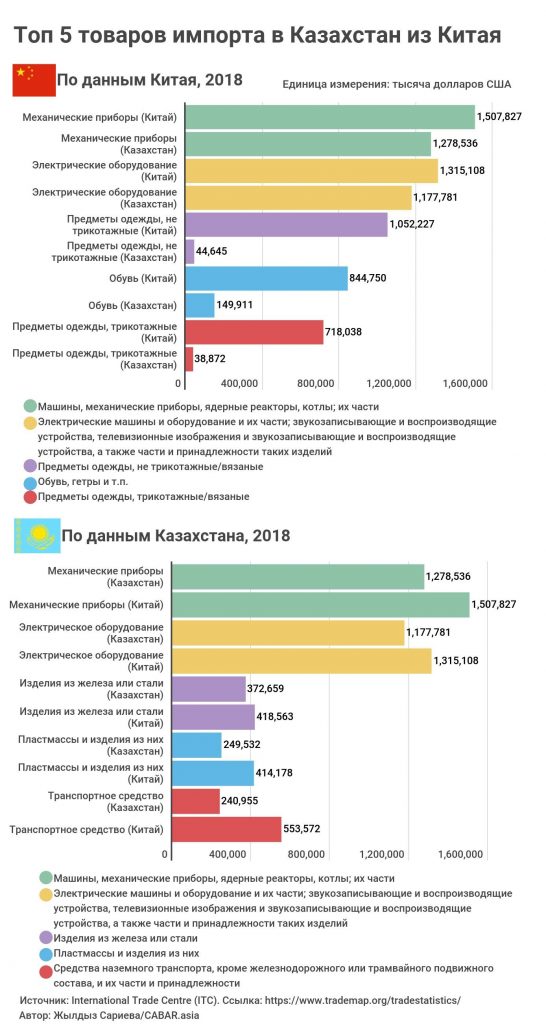 Согласно внешнеторговым данным КНР, экспорт товаров из Китая в Казахстан в 2018 году составил 11,3 миллиарда долларов США, тогда как импорт Казахстана из этой страны – 5,4 миллиарда долларов США. Следовательно, отклонение составляет 5,9 миллиарда долларов США.