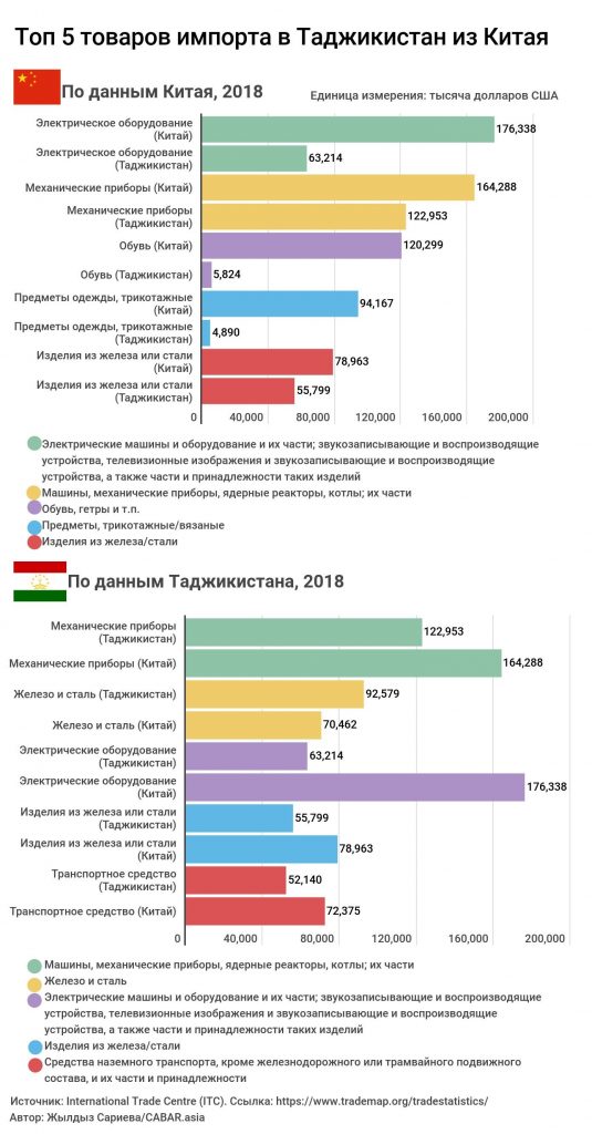 По данным Таджикистана, в пятерку товаров, импортируемых из Китая, входят механические устройства; железо и сталь; электрическое оборудование; изделия из железа и стали; средства передвижения.