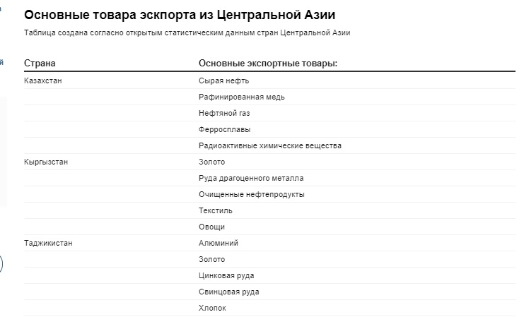 Ранее, внимание различных медиа-платформ было сосредоточено только на импорте в страны Центральной Азии. Давайте посмотрим данные экспорта из региона. Какие страны Центральной Азии сотрудничают для экспорта собственных товаров и различие в объеме товарооборота. Основными экспортными товарами из Центральной Азии являются – сырье и природные ресурсы.