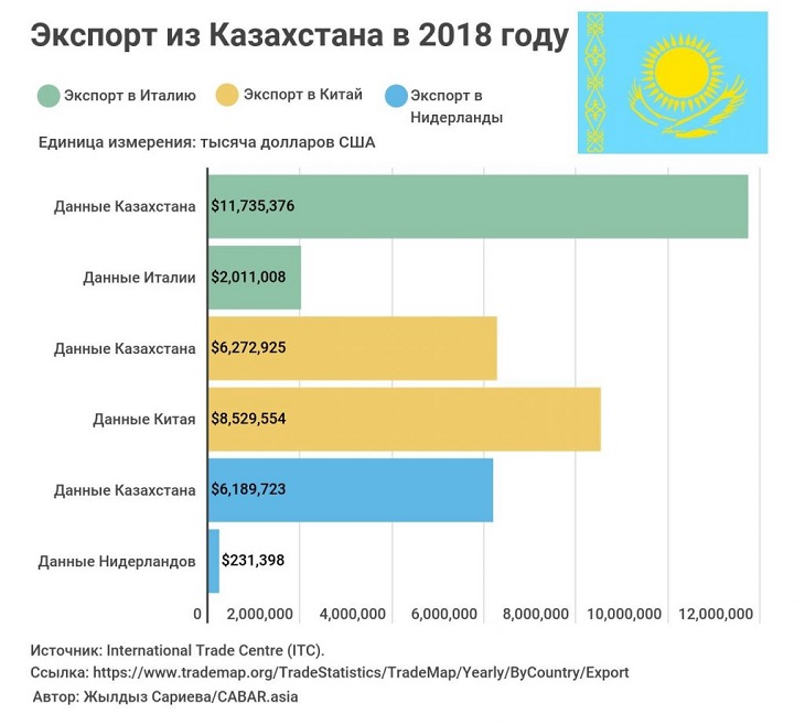 Согласно данным об импорте Италии, страна получила от Казахстана товары на 2 миллиарда долларов США. В то же время статистика Казахстана показывает, что Италия импортировала из Казахстана товары на сумму 11,7 миллиарда долларов США. Отклонение составляет 9,7 миллиарда долларов США.