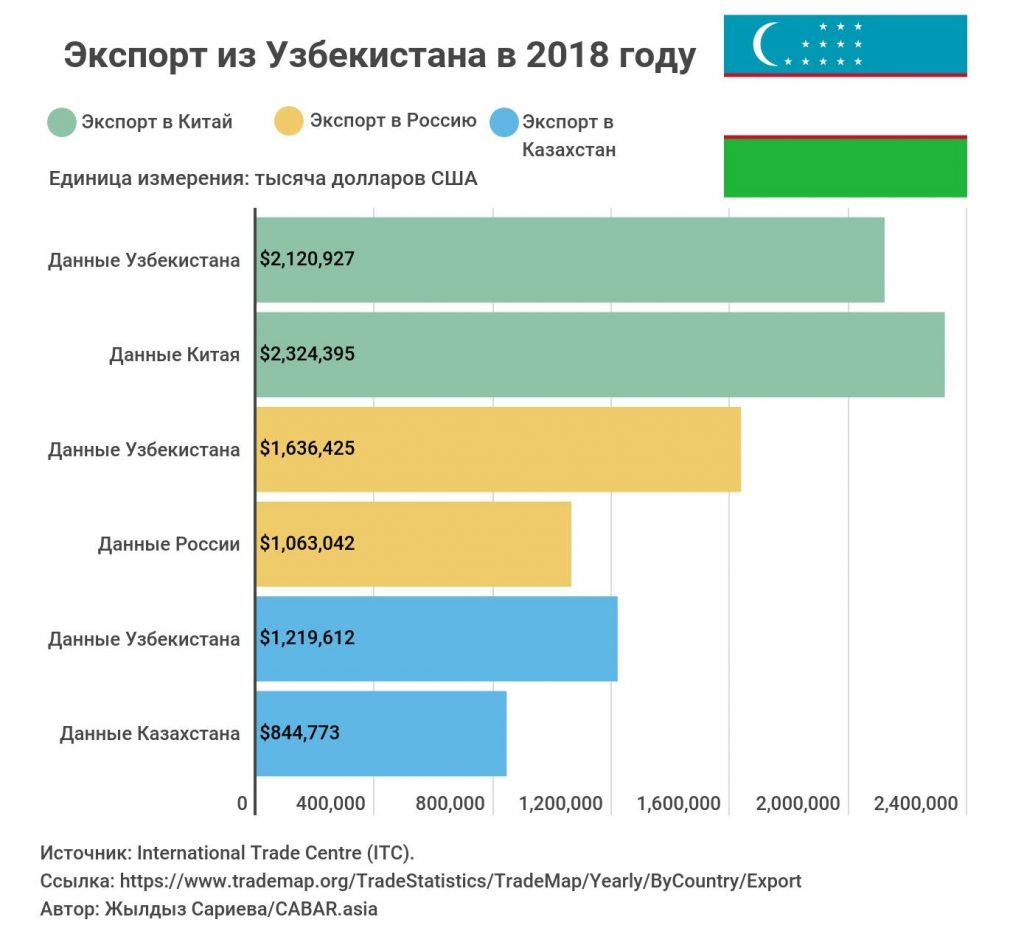 Статистика Узбекистана показывает, что экспорт в Казахстан составляет 1,2 миллиарда долларов США, тогда как статистика Казахстана показывает только 844 миллиона долларов США, разница в 375 миллионов долларов США.