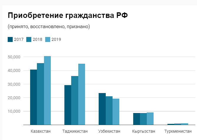 125 000 уроженцев Центральной Азии получили российские паспорта в 2019 году. Для сравнения – 5300 уроженцев ЦА получили гражданство стран Европейского Союза в 2017 году, и 3200 бывших центральноазиатов стали американцами в 2018 году.