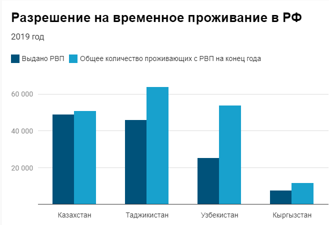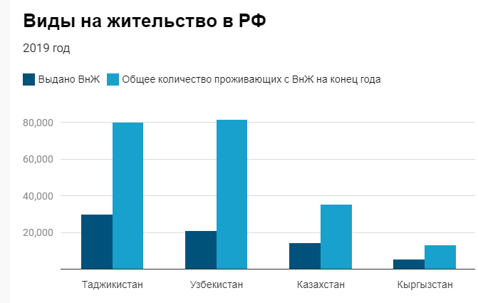 Только в 2019 году почти 185 000 человек получили вид на жительство в Российской Федерации и к концу года количество тех, кто в России проживал по этому документу, составляло в округленном виде 625 000 человек. Учитывая, что новые миграционные законы РФ позволят иметь бессрочный вид на жительство (некоторые эксперты связывают это нововведение со стремлением убрать основания у мигрантов подавать на гражданство), возможно, это число будет постоянно расти. И ему есть, куда расти – например, США в 2018 году предоставили вид на жительство одному миллиону ста тысячам человек, хотя, справедливости ради, нужно сказать, что только 8000 из них достались уроженцам пяти стран Центральной Азии.