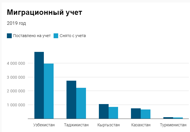 В этой статистике есть огрехи. Система миграционного учета иностранных граждан в Российской Федерации необязательно является показателем миграционных трендов в этой стране. Эти данные могут, например, вообще не учитывать некоторое количество прибывших граждан в страну, так как от регистрации граждане Казахстана и Кыргызстана освобождены на срок менее 30 дней, а граждане Таджикистана в течение 15 суток могут пребывать в РФ без регистрации. Граждане Узбекистана и Туркменистана в течение семи рабочих дней должны поставить себя на учет. Если вы переезжаете с место на место, то должны перерегистрироваться. Миллионы в цифрах ниже проистекают из этих самых частых передвижений мигрантов. Этот учет также необязательно включает тех, кто въехал в Россию – некоторым трудовым мигрантам, возможно, приходится оставаться в тени, не вставая на учет.