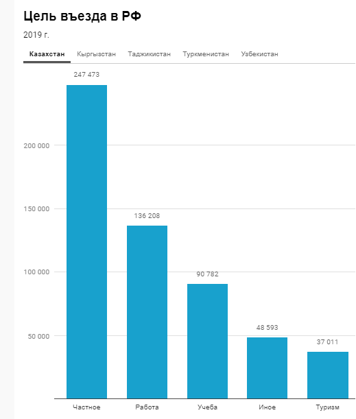 Узбекистан и Таджикистан занимают безоговорочные первые два места по количеству тех, кто въезжая в Россию в 2019 году, указал целью своего въезда работу. Причем, Таджикистану до Узбекистана в этой категории как до Луны – столько рабочих рук просто в Таджикистане не сосчитать. Но количество мигрантов, ищущих работу в России, у Узбекистана по сравнению с 2018 годом увеличилось на 100 000, а у Таджикистана на 160 000 человек!