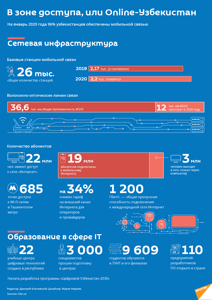 По официальным данным, на январь 2020 года мобильной связью в Узбекистане охвачены более 96% абонентов, а количество станций связи достигло 26 тысяч. Кроме того, растет число пользователей Всемирной паутины. Из 22 миллионов пользователей Сети 19 миллионов узбекистанцев выходят онлайн через мобильные устройства.