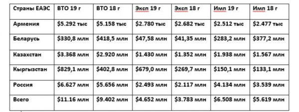 Внешнеторговый оборот Узбекистана и государств-членов ЕАЭС увеличился в 2019 году на 18,7 процента по сравнению с 2018 годом до $11,16 млрд, а его доля в совокупной внешней торговле республики снизилась с 27,8 до 26,4 процента.