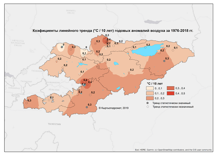 Наибольшие темпы роста температуры по Кыргызстану стали отмечаться с середины 90-х гг. прошлого века, и с тех пор каждое новое десятилетие среднегодовая температура в стране повышается на 0,2 градуса. Наибольшее потепление отмечается в крупных городах – на 0,4 градуса за каждые 10 лет. Более быстрыми темпами в Кыргызстане теплеет в марте (в среднем на 0,8 градусов, а местами более чем на 1 градус за каждые 10 лет), и в феврале (в среднем на 0,4, а местами до 0,7 градусов за каждые 10 лет). В теплый период года, особенно в долинных зонах Кыргызстана и на востоке Прииссыкулья, стало значительно чаще наблюдаться такое природное явление, как волны тепла.