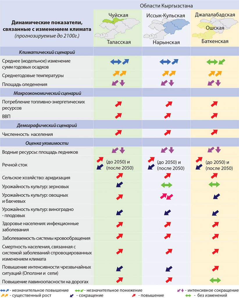 Схема “Основные тренды, связанные с изменением климата в Кыргызстане, на период с настоящего момента (2009г.) до 2100.