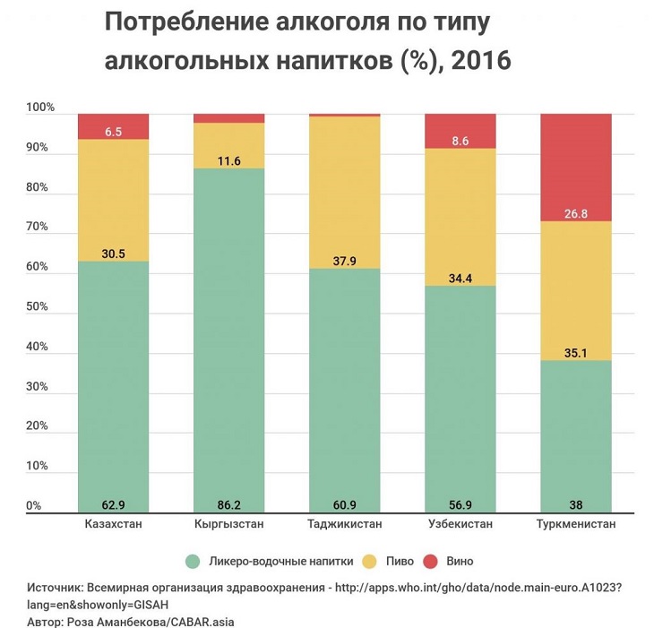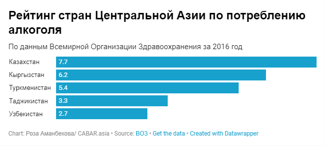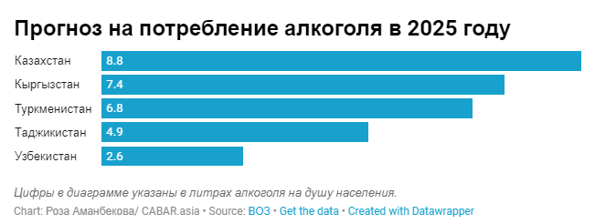 Потребление алкоголя – это социальная проблема в Центральной Азии. Власти стран региона регулярно устраивают кампании по уменьшению потребления алкоголя и улучшению здоровья граждан. Тем не менее проблема остается актуальной и данные по региону показывают интересные цифры и тренды.