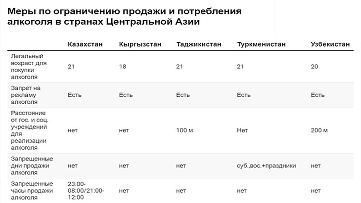 В Казахстане, Туркменистане и Таджикистане минимальный возраст для покупки алкоголя – 21 год, в Узбекистане можно покупать алкоголь с 20 лет и только в Кыргызстане разрешено покупать алкоголь в 18 лет.