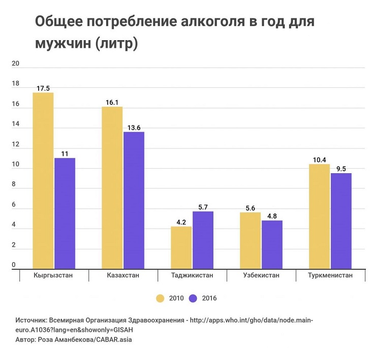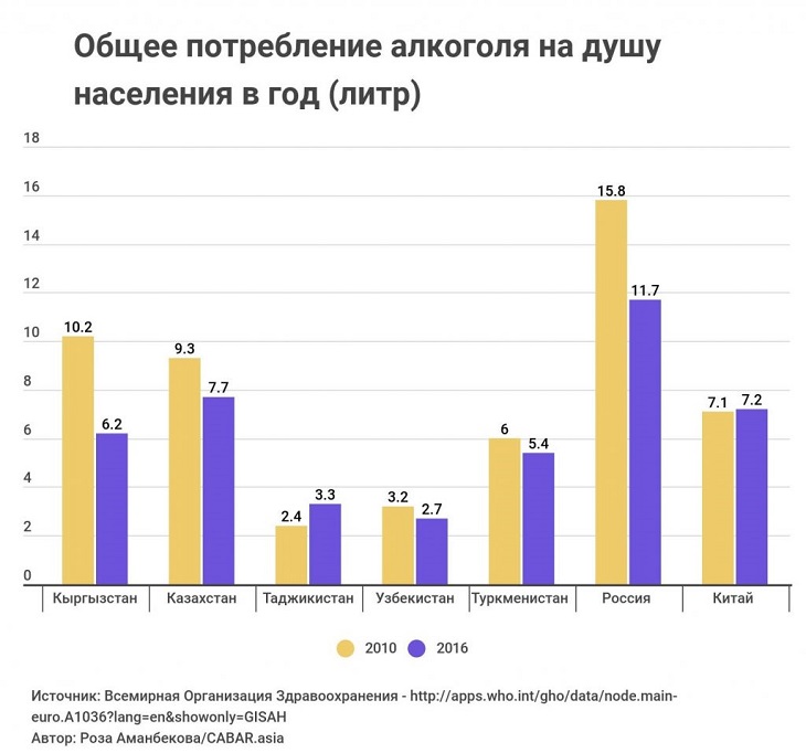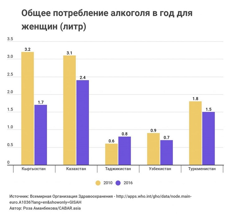 Такая же тенденция наблюдается и в Кыргызстане. Общее потребление алкоголя в Кыргызстане сократилось за последнее десятилетие. По данным ВОЗ в 2016 году потребление алкоголя составляло 6.2 литра на душу населения, в то время как в 2010 году это число было 10.2 литра на человека.