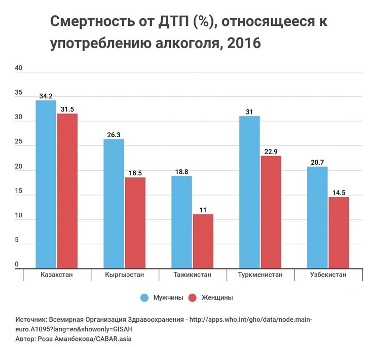 В 2016 году в Казахстане процент смертности от ДТП, связанного с употреблением алкоголя, равняется 34.2 % для мужчин и 31.5 % для женщин. Вторым в списке стоит Туркменистан, где процент смертности от ДТП вследствие употребления алкоголя, составляет 31 % для мужчин и 22.9 % для женщин. За ними следуют Кыргызстан, Узбекистан и Таджикистан.