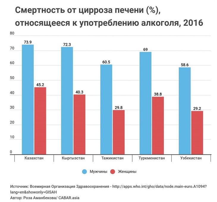По данным ВОЗ 2016 года, процент смертности от цирроза печени, причиной которого было употребление алкоголя, в Казахстане составляет 73.9 % для мужчин и 45.2 % для женщин, в Кыргызстане – 72.3 % для мужчин и 40.3 % для женщин, в Туркменистане – 69 % и 38.8 %, в Таджикистане – 60.5 % и 29.8 %, в Узбекистане – 58.6 % и 29.2 %.
