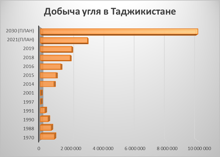 В 2014 году в Таджикистане было добыто 870 тысяч тонн угля, свыше 1 млн. тонн в 2015 году и более 1,3 млн. тонн по итогам 2016 г. В 2018 г. Министерство промышленности и новых технологий отчиталось о новом рекорде – угольные предприятия дали стране 1,9 млн. тонн этого топлива. По официальным данным, в 2018 г. углем в необходимом объеме были обеспечены промышленные и энергетические предприятия и объекты народного хозяйства, а порядка 45 тысяч тонн ушло на экспорт.
