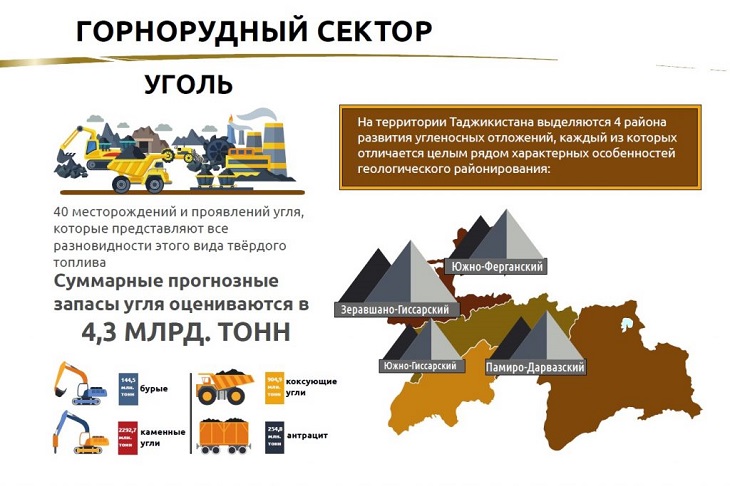 По имеющимся официальным данным, в Таджикистане находятся свыше 36 месторождений и проявлений угля, которые представляют все разновидности этого вида твёрдого ископаемого топлива: от бурого угля до каменного, включая коксующийся уголь и антрацит. Суммарные запасы угля в республике превышают 4 млрд. тонн.