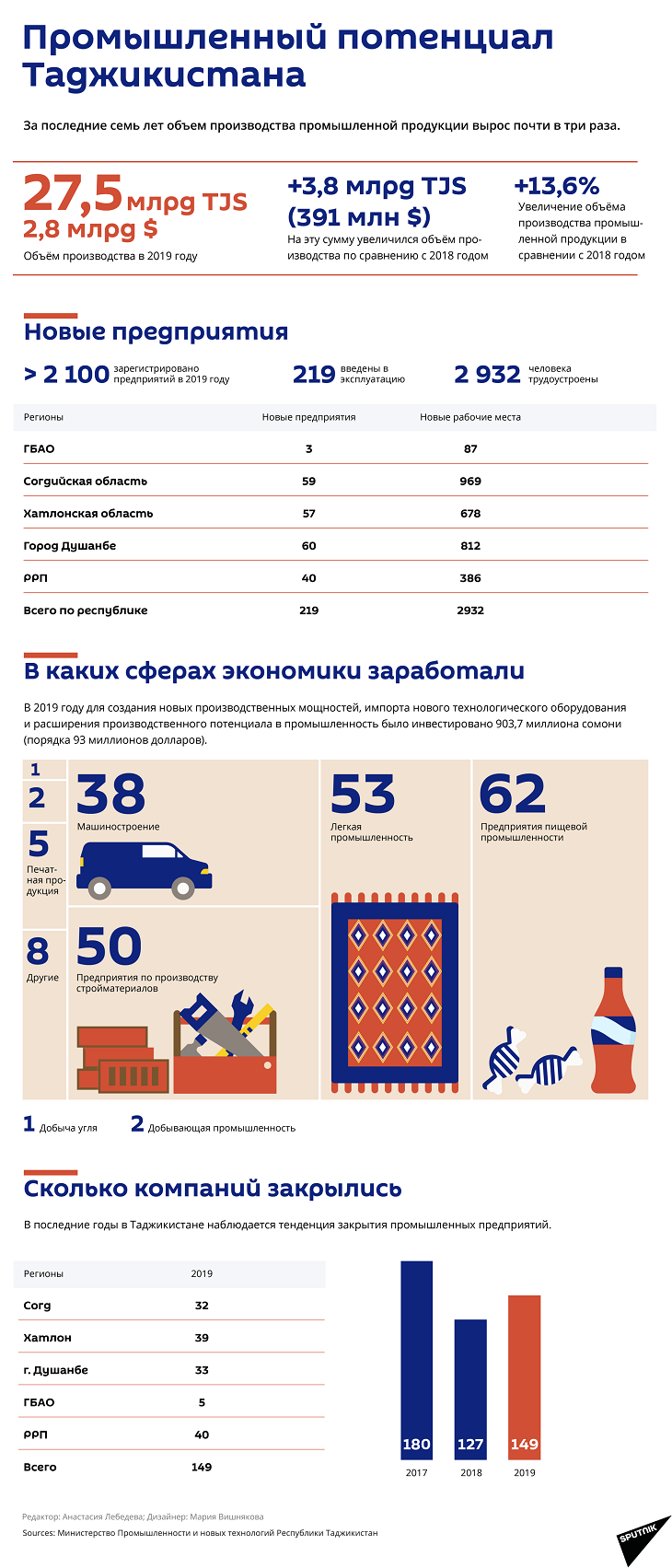 Увеличение объема производства по сравнению с 2018-м составило почти 14 процентов, то есть около 4 миллиардов сомони. Так, в прошлом году в Таджикистане было зарегистрировано более 2100 предприятий, 219 новых предприятий введены в эксплуатацию, рабочие места на них получили почти 3 тысячи человек.