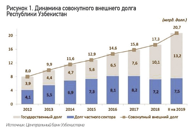 Согласно данным Центрального банка Республики Узбекистан, совокупный внешний долг страны в 2018 году составил $17,3 млрд. (25,4% к ВВП), что на 9,5% больше, чем в 2017 году.