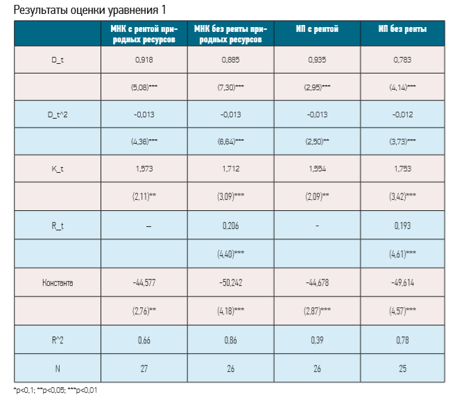 Оценка уравнения 1 выполнена методом наименьших квадратов (МНК) и методом инструментальных переменных (ИП), чтобы решить проблему причинно-следственной связи между внешним долгом и экономическим ростом. Результаты оценки предоставлены в соответствующей таблице, и они подтверждают гипотезу нелинейной взаимосвязи между внешним долгом и экономическим ростом. Вычисленный порог внешнего долга по отношению к ВНП для Узбекистана равен 35%. С целью проверки надежности результатов оценки были рассмотрены случаи с/без добавления ренты для природных ресурсов, так как Республика Узбекистан во многом зависит от их торговли. Результаты показали, что коэффициенты основных переменных не изменились и остались на статистически значимом уровне.