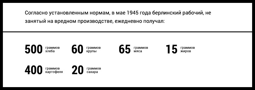 У генерала Берзарина забот с каждым днём только прибавлялось. В берлинских руинах оставалось огромное количество мирных жителей, по некоторым оценкам, от полутора до двух миллионов человек.