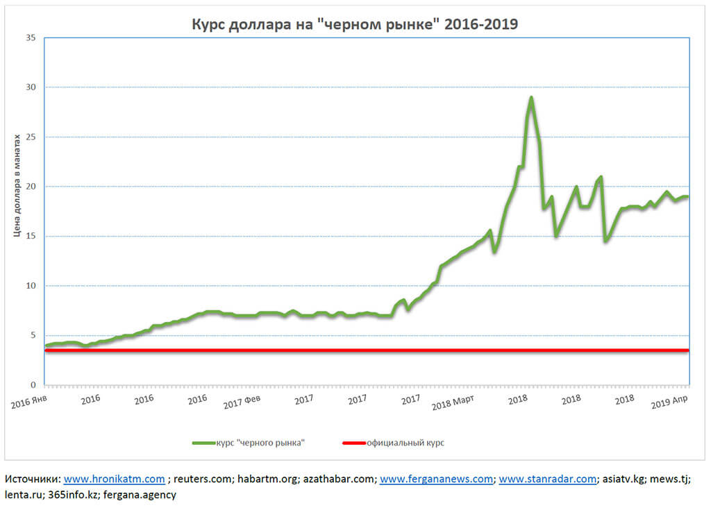 22 марта стоимость доллара на «черном рынке» Ашхабада при продаже достигла 20 манатов. Покупка составляет 19,7 манатов.