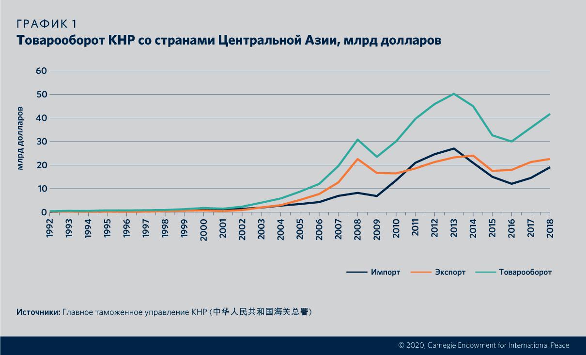 В целом, по данным таможенной службы КНР, за 2018 год товарооборот с пятью странами Центральной Азии составил более $41,7 млрд. И хотя в импорте КНР на эти страны приходится всего 0,8%, а в экспорте — 0,9%, асимметричная зависимость региона от Китая растет. Для центральноазиатских стран сегодня китайская доля составляет около 22% всего экспорта и 37% импорта.