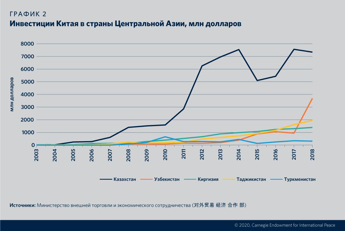 По данным Министерства коммерции КНР, всего в 2018 году объем накопленных прямых китайских инвестиций в пять стран Центральной Азии составляет $14,7 млрд (1,2% всех инвестиций Китая в страны Азии). В 2013 году этот показатель был на 40% меньше ($8,9 млрд).