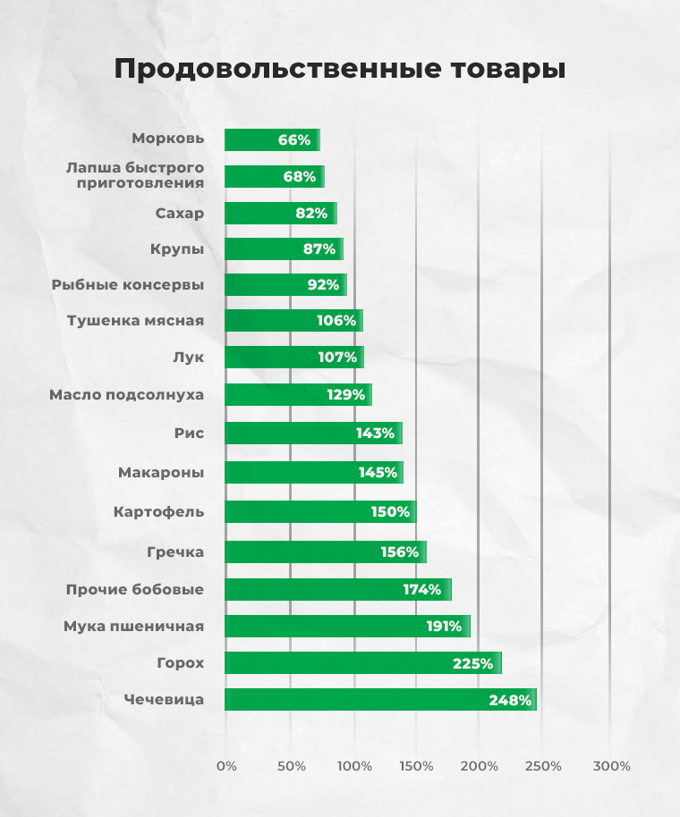 За чечевицей следуют пшеничная мука и бобовые. Выросли и продажи гречки – на 156%, картофеля, макарон, риса и подсолнечного масла.