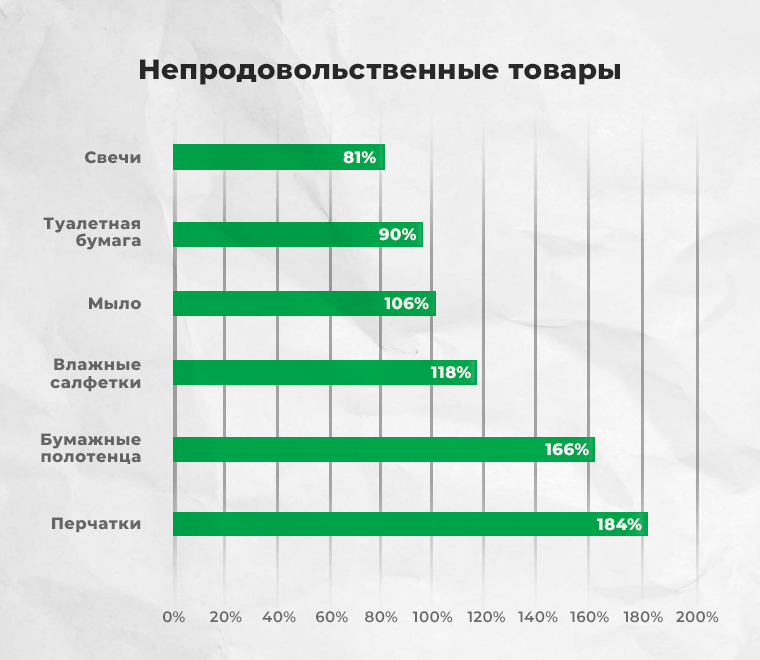 Ожидаемо вырос спрос на перчатки, за ними следуют другие средства гигиены – бумажные полотенца, влажные салфетки, мыло, туалетная бумага.