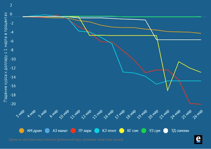 Грузинский лари оказался одной из наиболее пострадавших валют в регионе: в марте его курс упал на 20%, несмотря на то, что центральный банк продал 100 млн долларов.