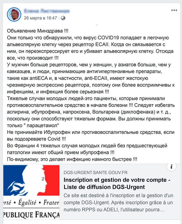 Очень тревожное сообщение со ссылкой на Министерство здравоохранения Франции появилось в интернете несколько дней назад. В нем неизвестный автор предупреждает пользователей воздержаться от употребления ряда лекарственных средств. Потому что они положительно стимулируют развитие коронавируса в организме человека, «вызывая его усиление в 5 и более раз!!!».