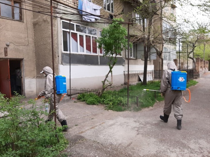 После обнаружения первых больных коронавирусом в Джалал-Абадской области мы начали реагировать как вспомогательный для госструктур орган. Сегодня вы видели, как мы продезинфицировали подъезды многоэтажек, детские игровые площадки, подземный переход и другие людные места. Занимаемся этим совместно с санэпидстанцией. В первые дни они обратились к нам с просьбой оперативно помочь обрабатывать школы и детские сады. Потом обратилась и мэрия, чтобы быстро продезинфицировать парки, базары и другие общественные места.
