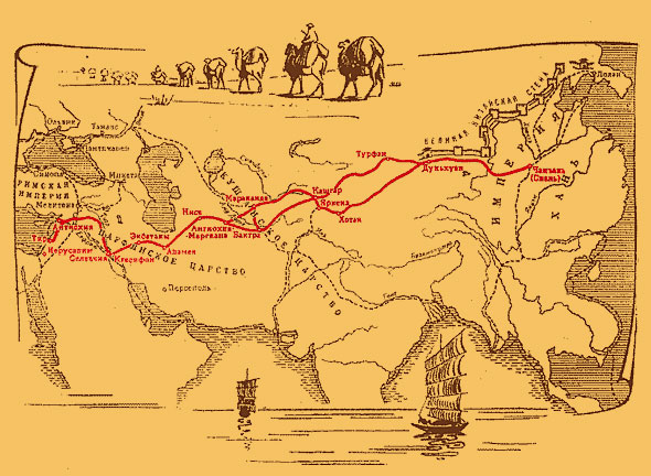 Так встретились древние цивилизации Средней Азии и Китая, а позже Средиземноморских стран и Индии. Сошлись в единое целое две великие дороги. Одна, шедшая с Запада, из стран Средиземноморья в Среднюю Азию, разведанная и пройденная греками в процессе походов Александра Македонского. Другая, ведущая с Востока, из Ханьской империи в Центральную Азию, разведанная Чжан Цянем, который прошел эту область с севера на юг через Давань, Кангюй, Согд, Бактрию.